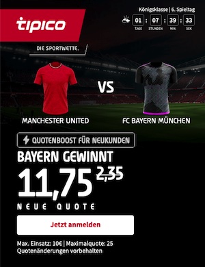 Die normalen Wettquoten bei Tipico für dieses Spiel sind wie folgt: Eine Wette auf einen Sieg von Manchester United wird mit der Quote 2.65 bewertet, ein Unentschieden mit der Quote 4.00 und ein Sieg von Bayern München mit der Quote 2.35 (Stand der Quoten: 11.12., 13:30 Uhr).